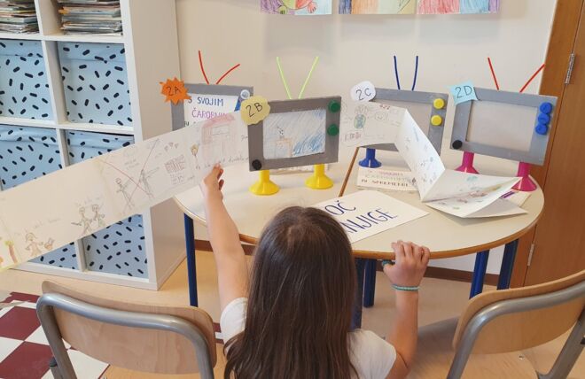 V ponedeljek, 13. aprila, smo na stari šoli preživeli čarobno popoldne na Noči knjige za drugošolce. Prebrali smo knjigo Malala in čarobni svinčnik, nato pa tudi sami ustvarjali prave čarobne stvari. Učenci so se zvrstili na 4 delavnicah, kjer so razmišljali o tem, kako bi spremenili svet, če bi imeli tudi sami čarobni svinčnik. Izdelali so si knjige, čarobne svinčnike-knjižne kazalke in celo »filmski trak«. Poslušali so zgodbe iz preteklosti, si ogledali kraje, kjer je živela Malala kot deklica, se povezovali ob igrah, plesu in prigrizku. Za slovo smo skupaj zapeli pesem Maček Muri. Dogodek je bil za vse nas super poučen in zabaven!
