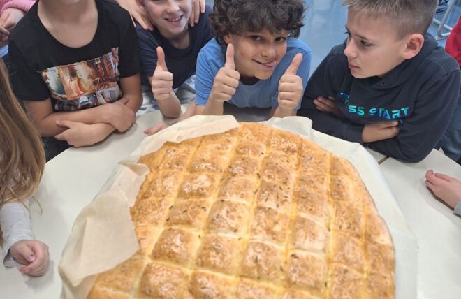 V 5. d znanje usvajamo na različne načine. Najbolj nam je všeč, ko v znanje lahko ugriznemo. Danes smo v okviru družbe poskusili belokranjsko pogačo in zaplesali belokranjski kolo.